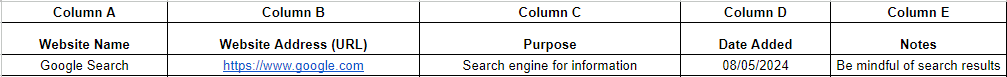 - Notes: Additional comments or warnings about the website.